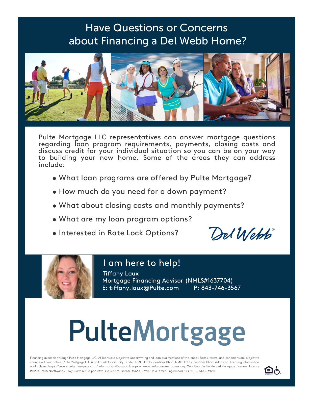 Community Association and golf fees may be required. Prices, promotions, incentives, features, options, amenities, floor plans, elevations, designs, materials, and dimensions are subject to change without notice. Square footage and dimensions are estimated and may vary in actual construction. Community improvements and recreational features and amenities described are based upon current development plans which are subject to change and which are under no obligation to be completed. Actual position of house on lot will be determined by the site plan and plot plan. Floor plans, interiors and elevations are artist's conception or model renderings and are not intended to show specific detailing. Floor plans are the property of PulteGroup, Inc. and its affiliates and are protected by U.S. copyright laws. For further information, see our terms of use. This is not an offering to residents of NY, NJ, CA or CT or where otherwise prohibited by law. Pulte Home Corporation is a licensed California real estate broker (Lic. # 00876003).